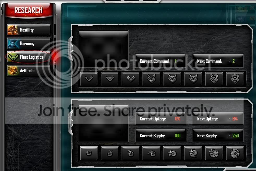 The bottom bar shows you how much upkeep you are paying for how many supply points. If you need more points, you have to research the next level. However, the upkeep will increase (as a percentage of your total income (all 3)). So there is no point researching it too early as you will be reducing your income and not using the slots as you won't be able to buy the ships anyway. The flip side is you have heaps of income and no ships points free so cannot buy new ships either